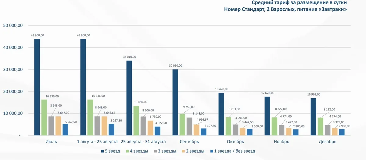 А у крымских отелей 3* с завтраками среднесуточный тариф в июле-сентябре ниже на 32-39%, чем у сочинских конкурентов, и здесь «трехзвездочный» отдых был в летнем сезоне самым выгодным по цене.