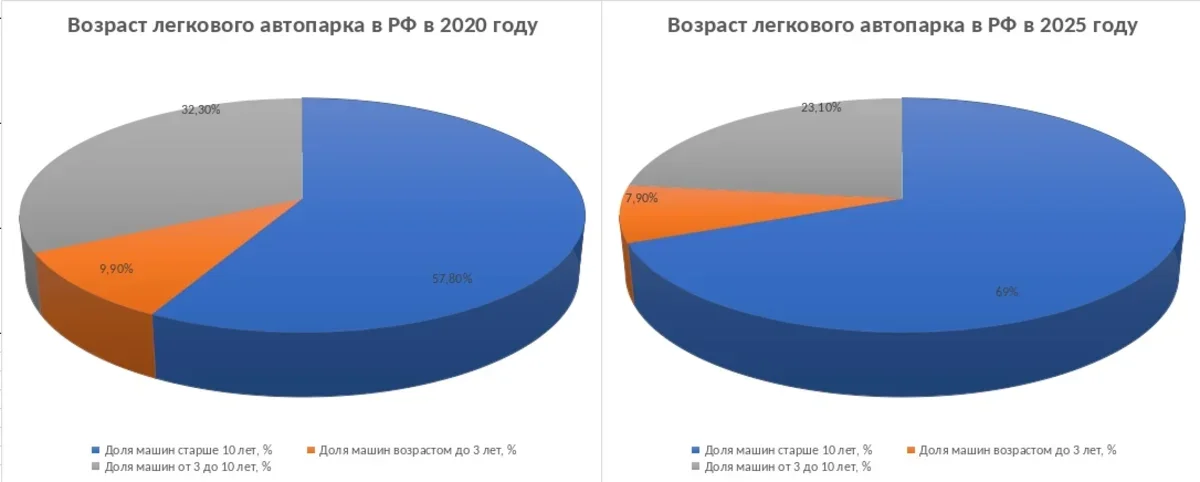 Если в 2020 году доля машин старше 10 лет составляла 57,8%, то к началу 2026 года показатель вырос до 69% (32,73 млн шт.). Парк постарел более чем на 10 процентных пунктов.