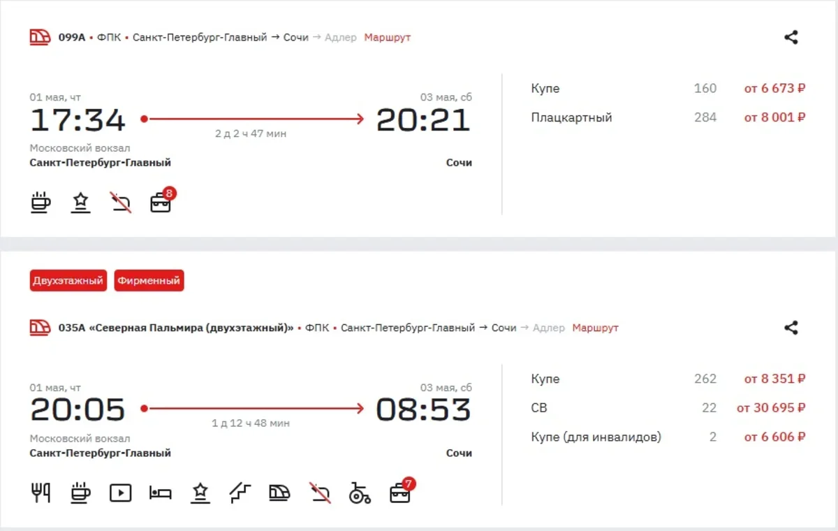 Из Северной столицы в Сочи на майские выйдут два поезда. Купе стоят от 6,7 тыс. рублей, плацкарт – от 8 тыс. рублей, СВ – от 30,7 тыс. рублей. Дефицита железнодорожных билетов на них нет.