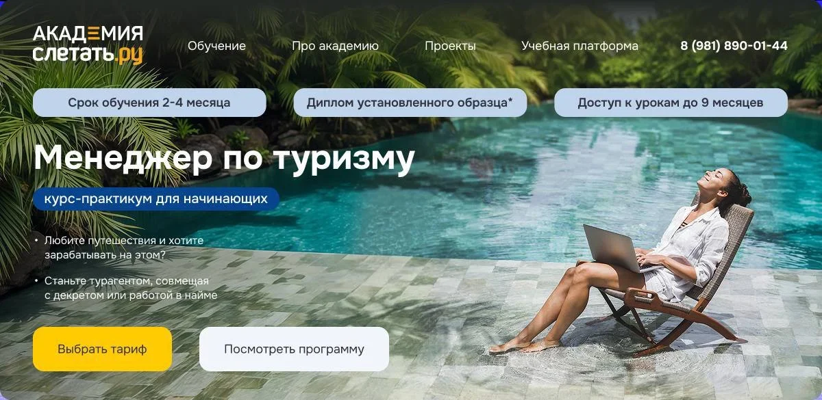 Курс предлагает три уровня погружения («Старт», «Практик» и «Эксперт») и приводит обучающего к конкретному результату: первому самостоятельному бронированию, психологии продаж, а также разработке стратегии развития личного бренда. Узнать подробнее о программе можно здесь.