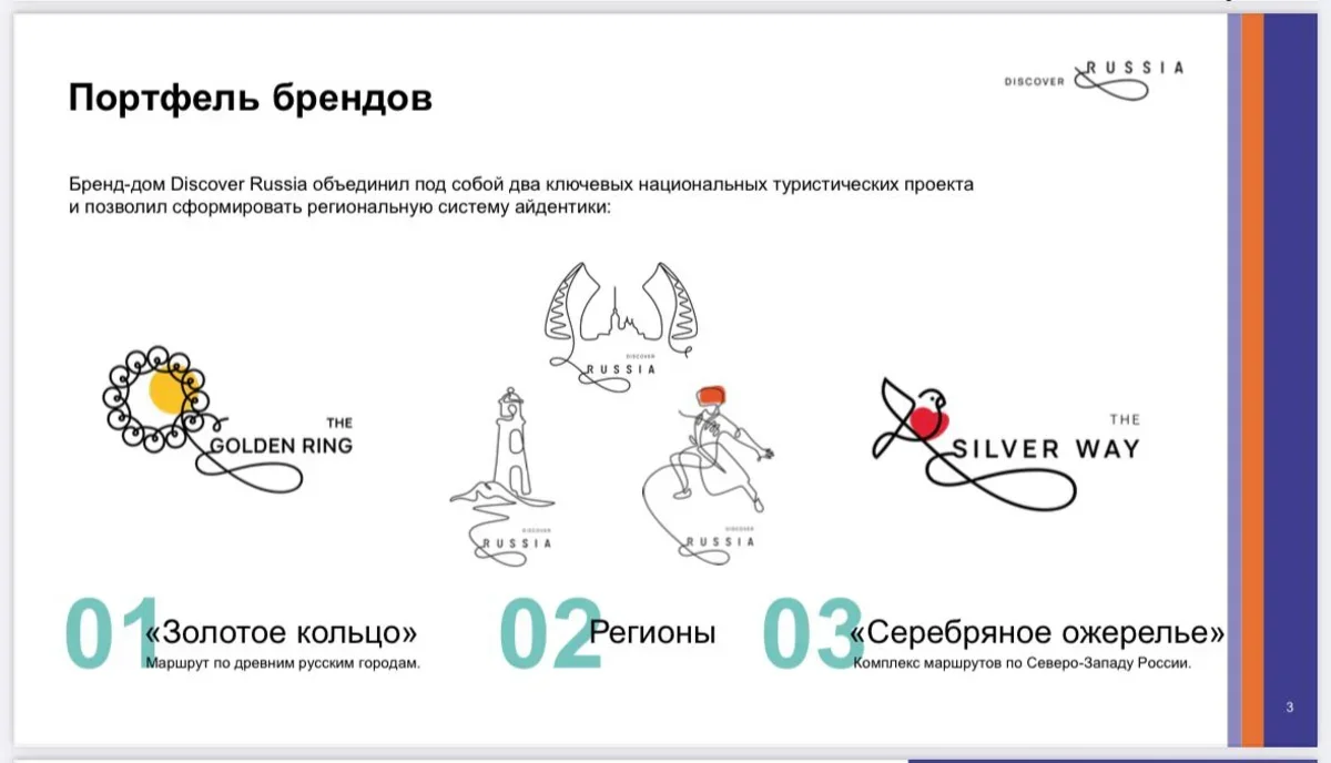 ЦСР оказывает всестороннюю поддержку в создании уникальной айдентики (совокупности элементов, формирующих узнаваемый и привлекательный образ бренда, включая логотип, цветовую палитру, фирменный стиль и т.д.) не только регионам, но и крупным федеральным туристическим проектам, таким как «Золотое кольцо» и «Серебряное ожерелье».