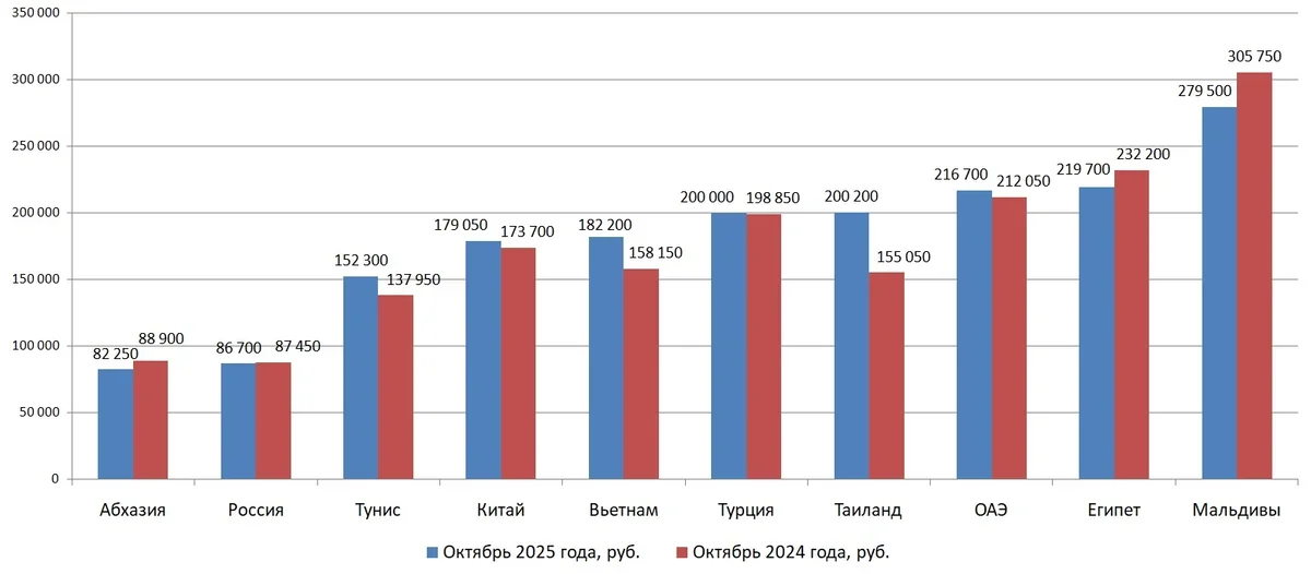 Рис. 1. Средняя цена реализованного турпакета с перелетом в ТОП-10 популярных стран в октябре 2025 и 2024 годов (в среднем на 2,2–2,5 туристов).