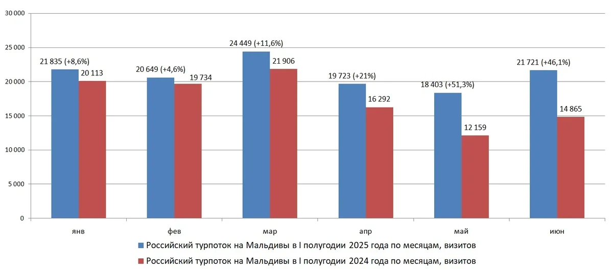 При этом в мае и июне годовой прирост был и существенно больше: +51,3% и +46,1%, соответственно. Цифры начала лета фактически сравнялись с нынешним январем. Летние продажи туров на Мальдивы туроператоры считают крайне успешными, а направлению предсказывают очередной исторический рекорд по российскому турпотоку по итогам 2025 года.