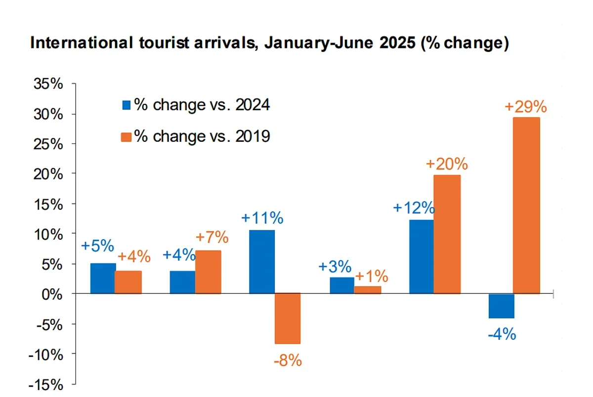 На Ближнем Востоке количество прибытий сократилось на 4% по сравнению с первой половиной 2024 года, но остаётся на 29% выше, чем в 2019 году, что является самым высоким показателем восстановления среди всех макрорегионов мира.