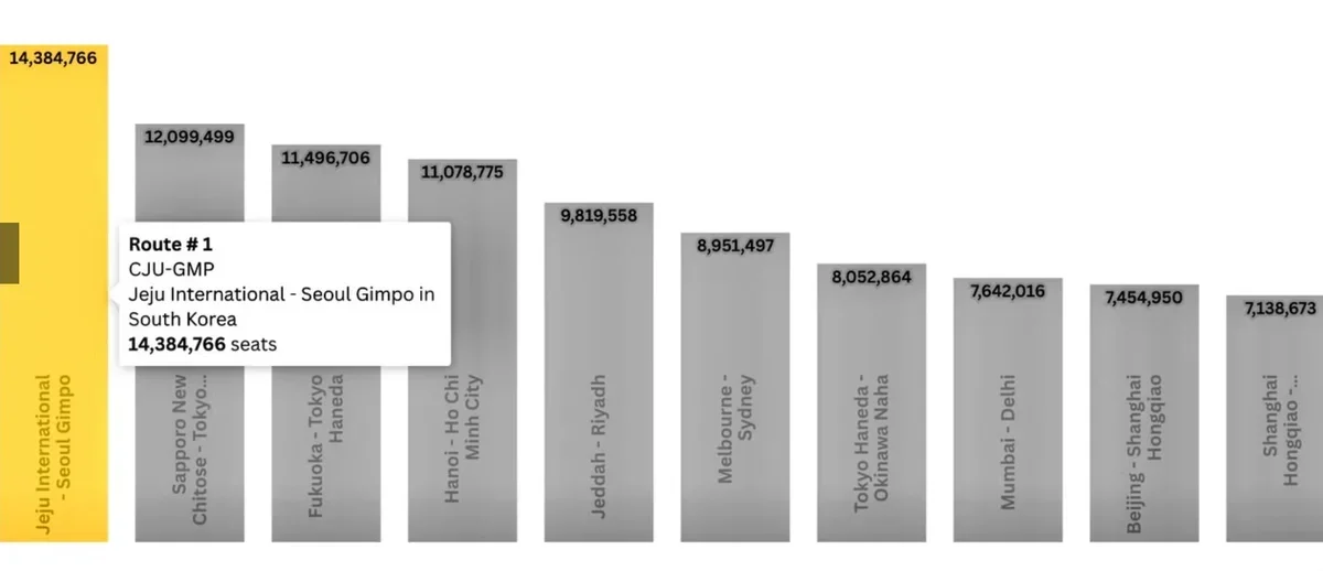 Самый оживленный из них – в Южной Корее, между Чеджу и международным аэропортом Сеул Кимпхо. На этом маршруте протяженностью всего 450 км в 2025 году было запланировано 14,4 млн посадочных мест, или почти 39 000 мест ежедневно.