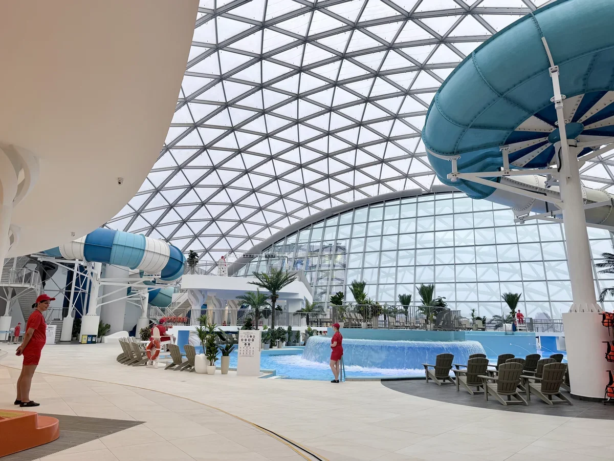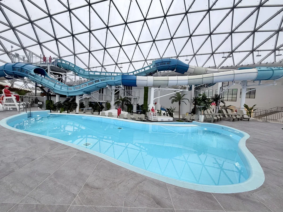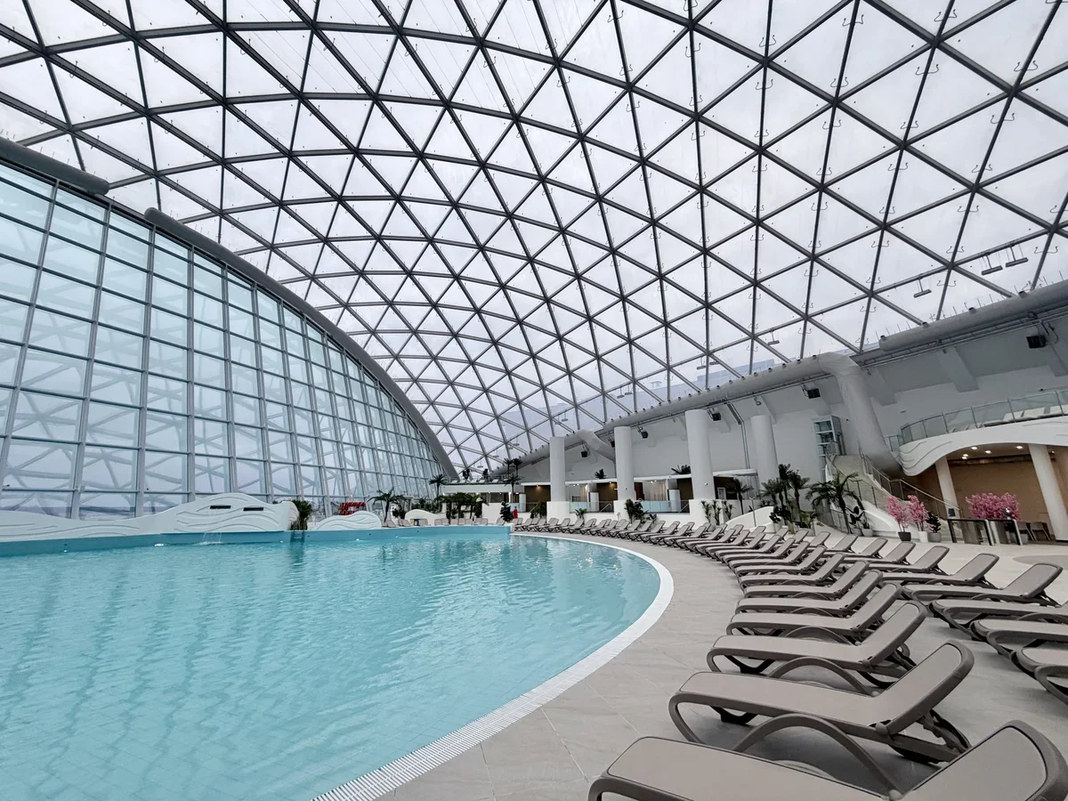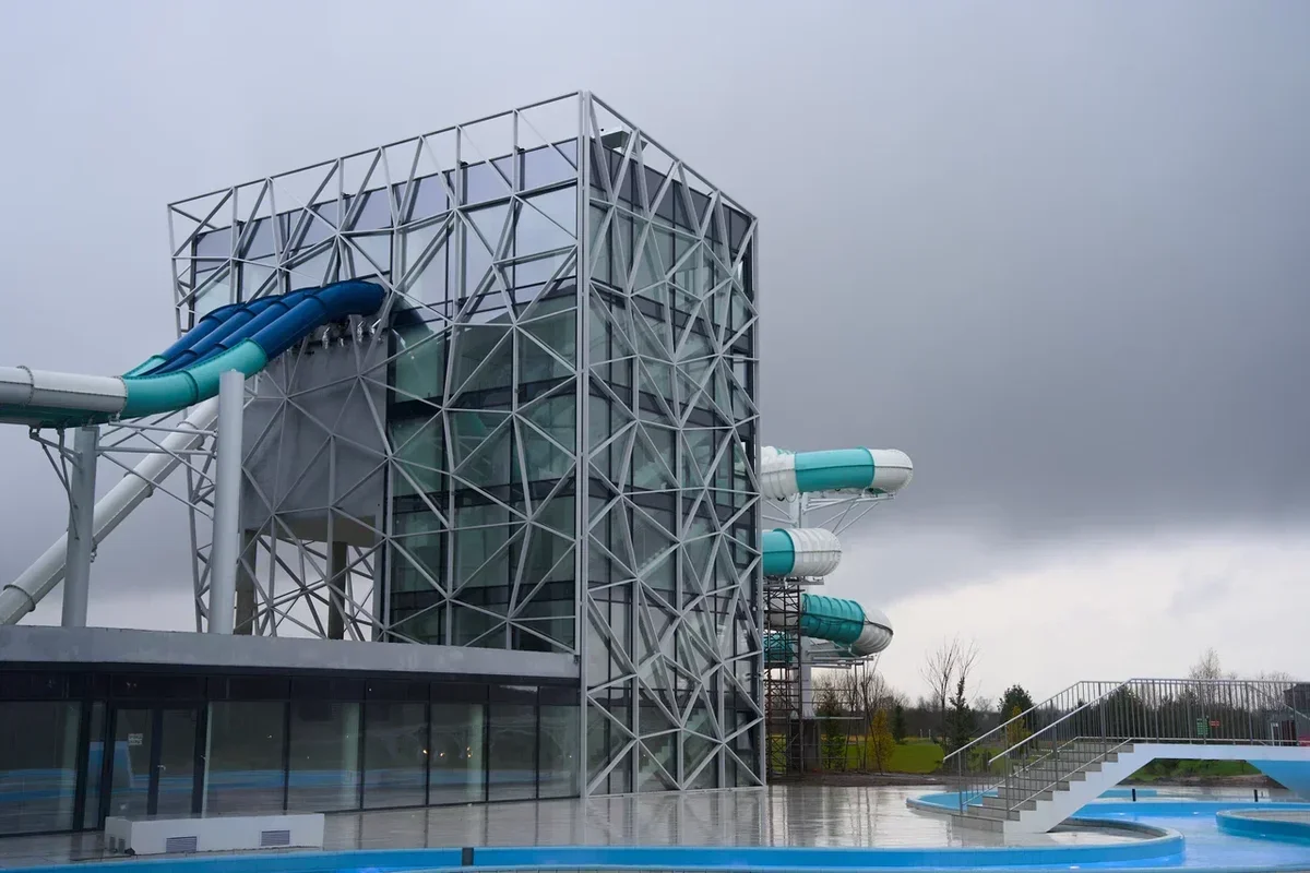 Уникальна конструкция кровли аквапарка. Два купола покрыты специальной пленкой, которая пропускает естественный солнечный свет и ультрафиолет. Это позволит гостям загорать в аквапарке, даже зимой.