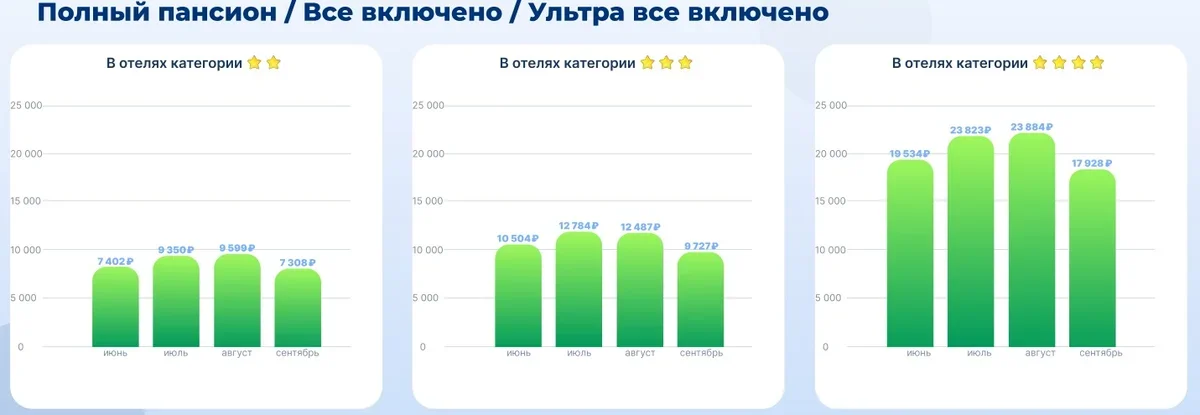 У отелей 3* (с питанием «полный пансион» и «все включено») также максимальные тарифы в июле и августе – 12,5-12,8 тыс. рублей в сутки за стандартный двухместный номер. В июне – 10,5 тыс., а в сентябре – 9,7 тыс. рублей.