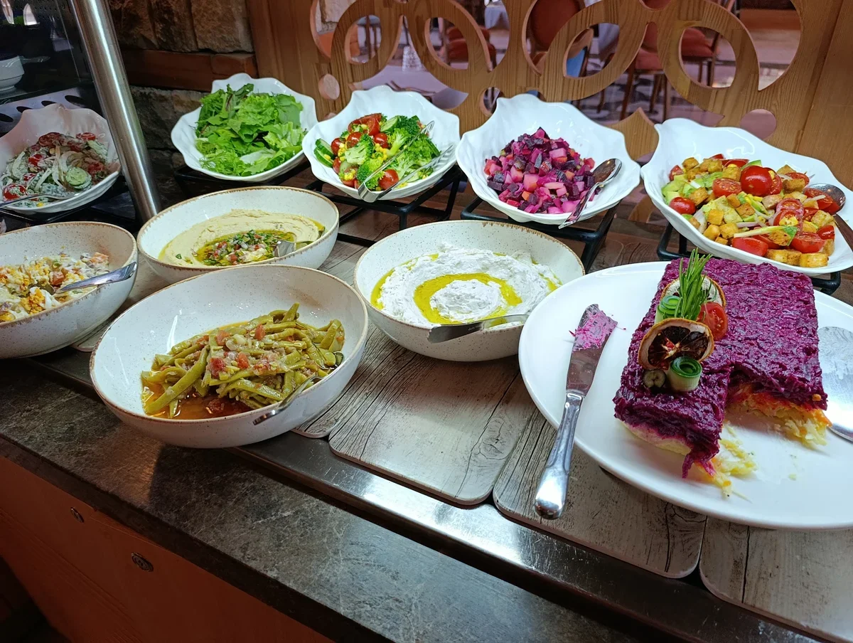 Есть пресловутая красная и белая рыба на завтрак, каждый день креветки, мидии, вкуснейшие домашние салаты – знакомые селедка под шубой, мимоза, оливье, столичный, салат с креветками и пр.