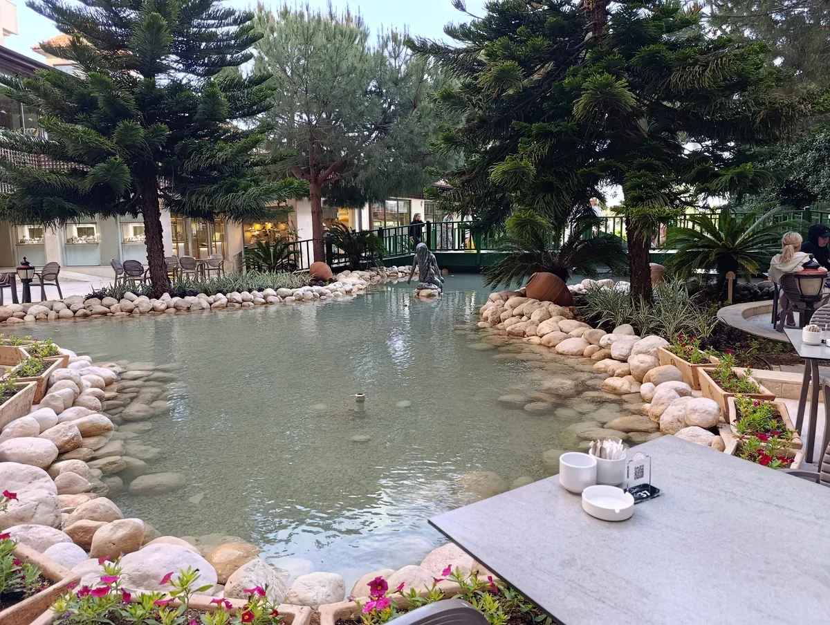 Здесь зелено, вековые сосны, постриженные газоны, изящные фонари и свой красивый бассейн с мостиками.
