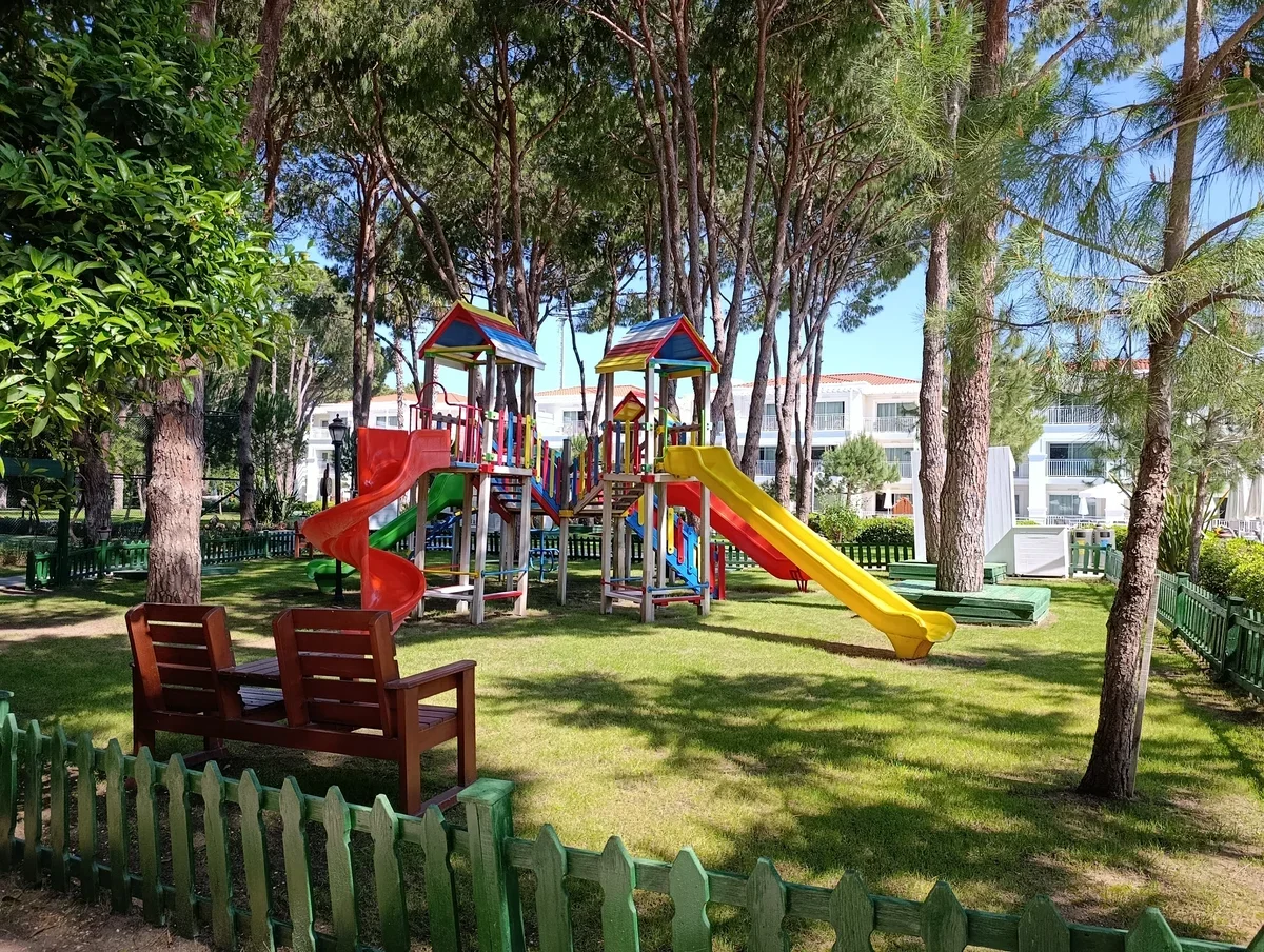 Рядом расположены отдельная детская площадка – с мягчайшим газоном и в густой тени сосен. Тоже только для гостей номеров Jasmine. И рядом с ней – хороший теннисный корт.