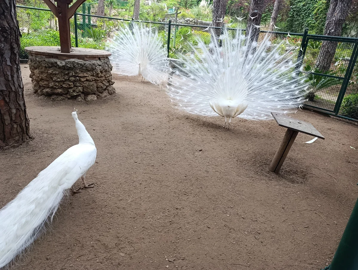 С ланями, розовыми фламинго, страусами, ланями, огромными попугаями, фазанами, павлинами (их много, есть даже три редких белых павлина из Индии), обезьянами.