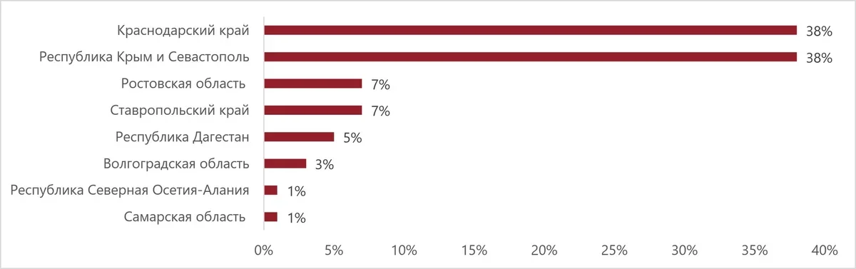 Согласно данным NF GROUP, 76% виноделен с туристической инфраструктурой расположены в Краснодарском крае и Крыму. То есть более трех четвертей.