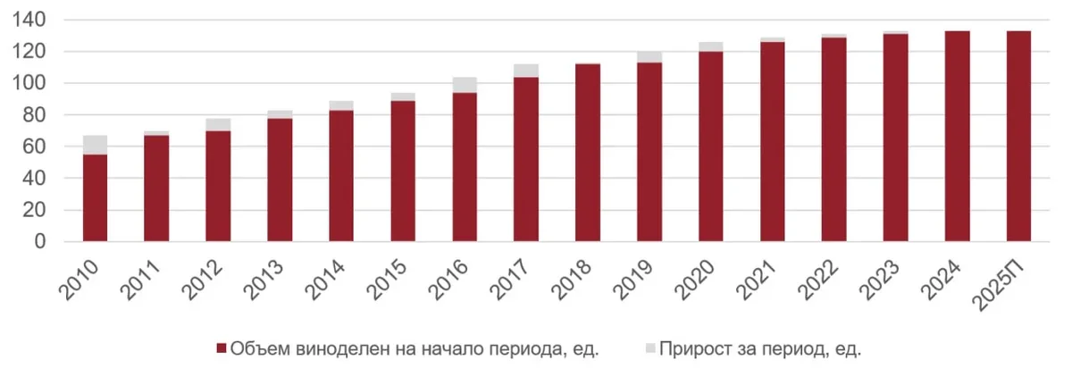 Динамика открытия виноделен с туристической инфраструктурой в России (2010-2025 гг). Источник: NF GROUP