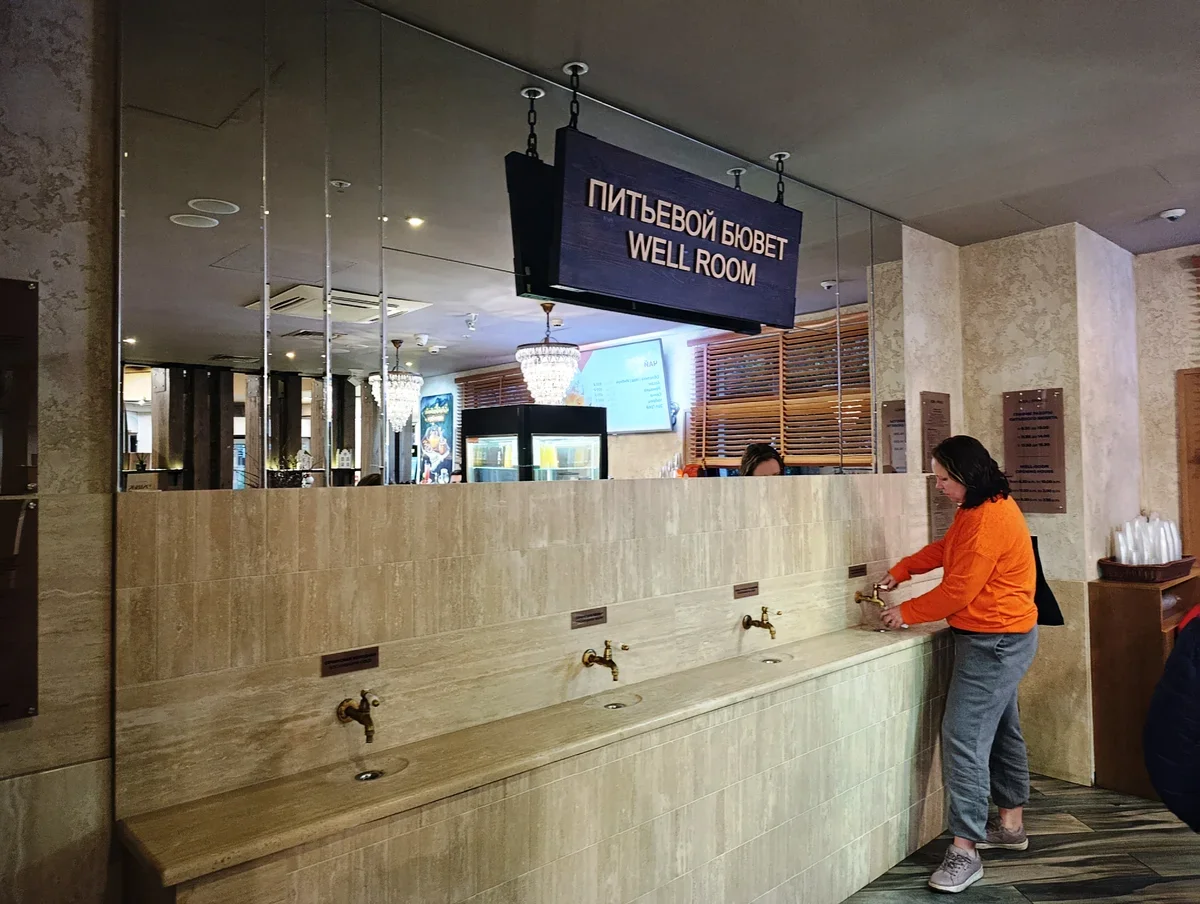 Кстати, перед приемом пищи можно выпить стаканчик минеральной воды, рекомендуют за полчаса. В полном соответствии со статусом санатория, в Rosa Springs есть и собственный бювет с минеральной водой (Сочинская и Пластунская).