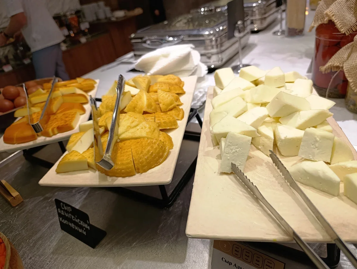 Красивое «пятизвездочное» оформление шведского стола не мешает тому факту, что в меню здесь много полезных и вкусных блюд, в том числе местных специалитетов, свежих овощей, отличные сыры, разнообразно приготовленное мясо.