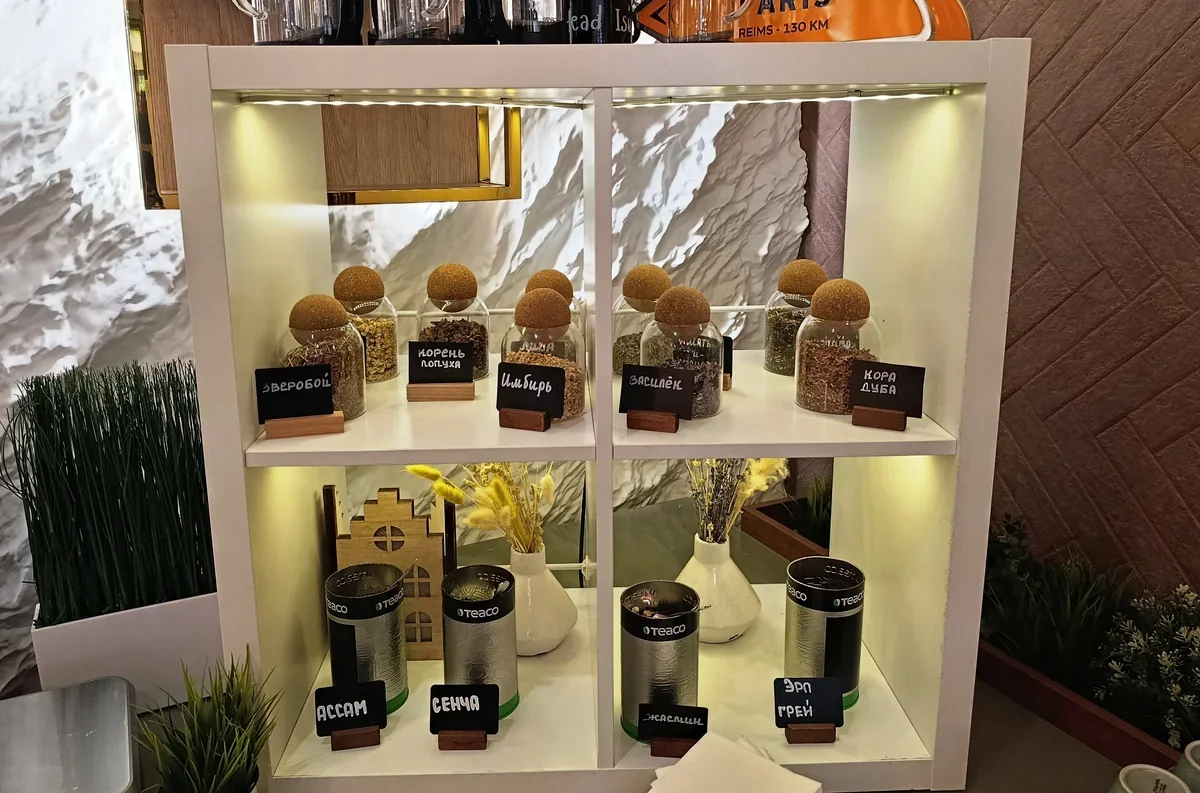 В ресторане есть и традиционный кофе, но внимание сразу привлекает огромный выбор высококачественных заварных чаев, от черных и зеленых до широкого набора травяных.