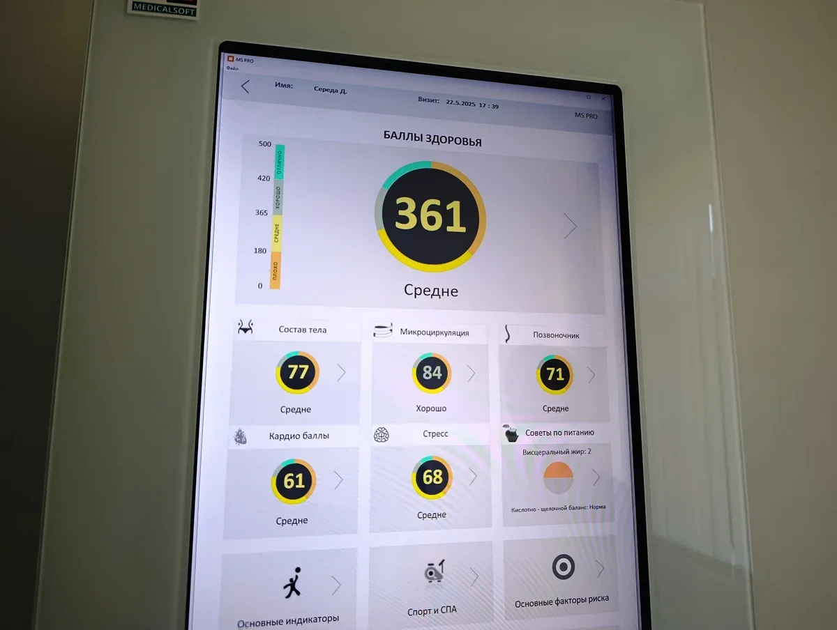 Для людей, которых интересует снятие стресса, избавление от синдрома хронической усталости и здоровый сон, в клинике рекомендуют сначала пройти check-up, он тут есть в нескольких разновидностях. Базовый проходит на специальном аппарате MS-PRO – как убедился наш корреспондент, он довольно точен – по крайней мере, аппарат определил реально существующие проблемы со здоровьем.