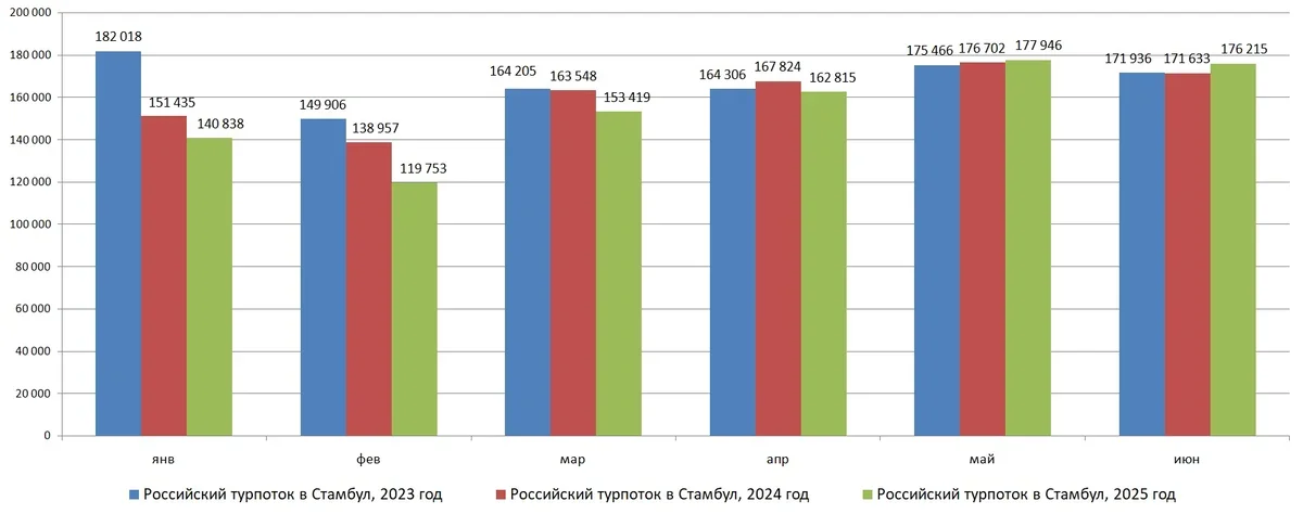 Тем не менее, на значительный прирост турпотока в Стамбул эксперты в этом году не рассчитывают. Скорее всего, в город, как и в прошлые годы, по итогам 2025 года прибудет около 2 млн россиян, вероятно, немного меньше этой цифры.
