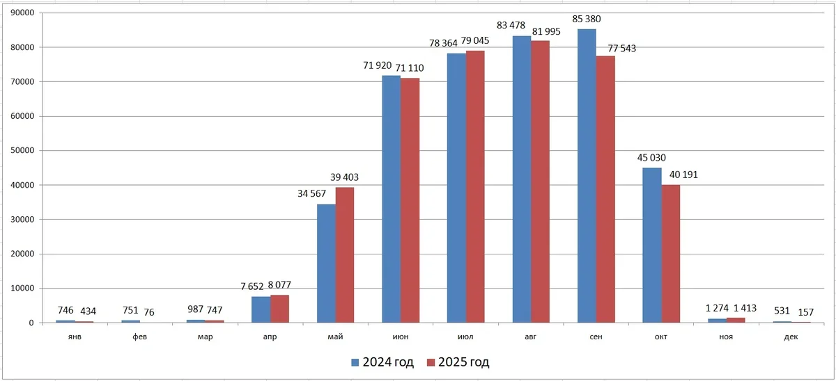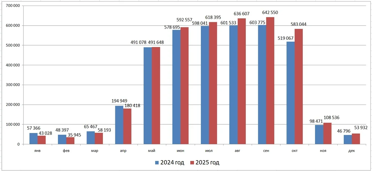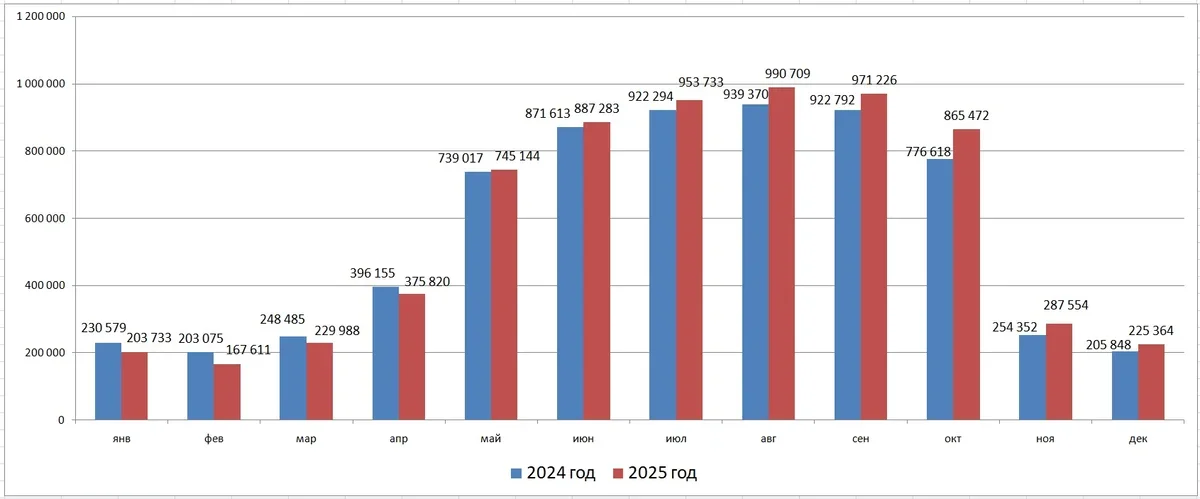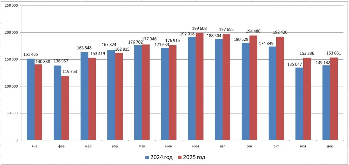 Так, апрель и май по сравнению с теми же месяцами 2024 года были в плюсе (+5,6% и +14% соответственно), а сентябрь и октябрь оказались в минусе (-9,2% и -10,7% по сравнению с 2024 годом).