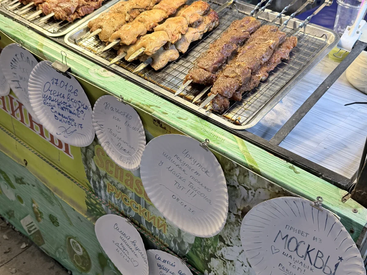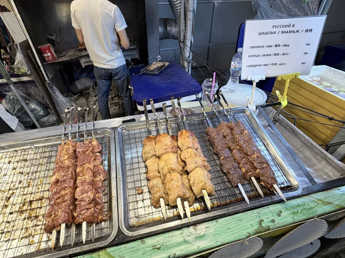 Действительно, в Паттайе дешевле, чем в Сочи в высоком сезоне. Например, шампур шашлыка (свинина) стоит 100 бат (250 руб.). Шашлык и правда вкусный. Россияне пробуют его и не скупятся на похвалу.