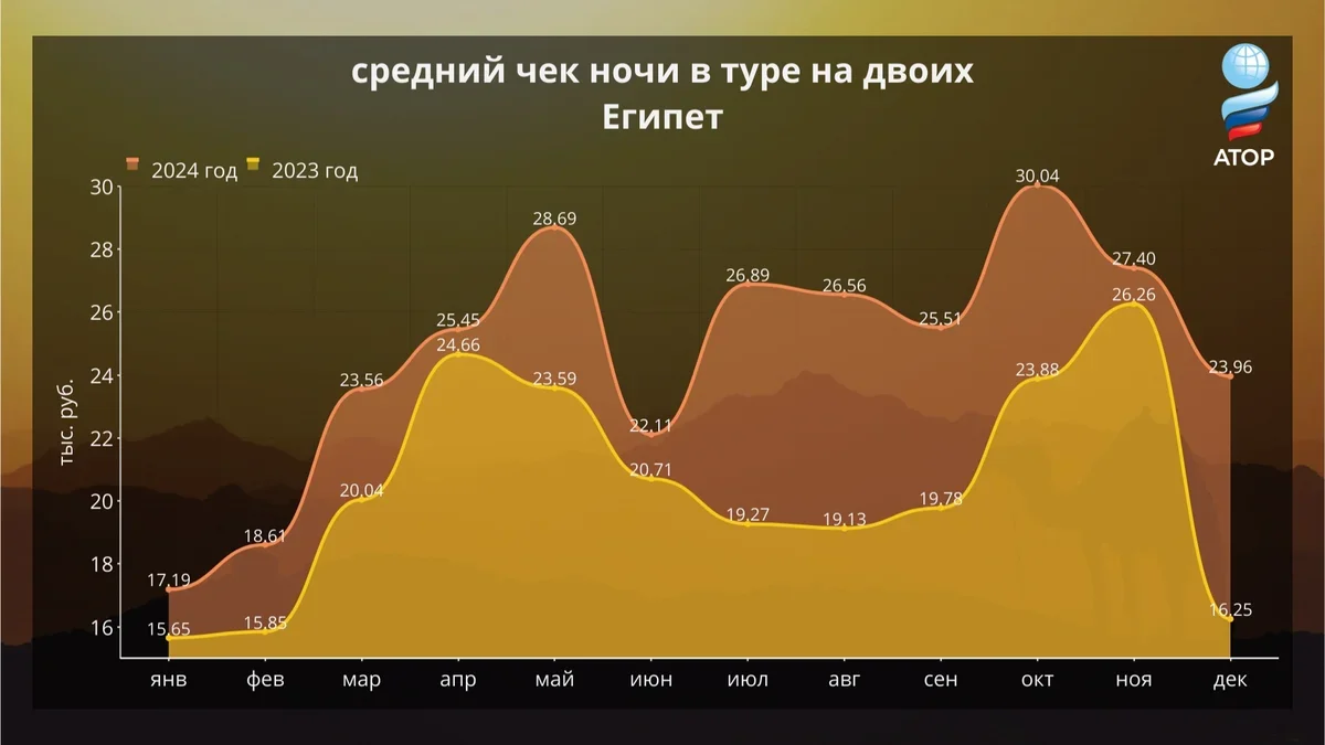Самый дорогие месяцы для отдыха в Египте в 2024 году – октябрь (стал лидером по дороговизне, в 2023 году таким был ноябрь), далее идут май и ноябрь.