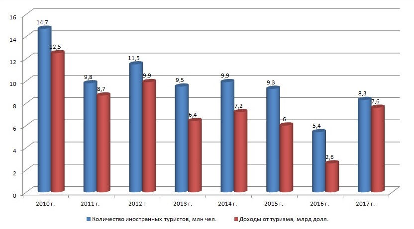Иностранный турпоток и доходы от туризма в Египте в 2010-2017 гг.