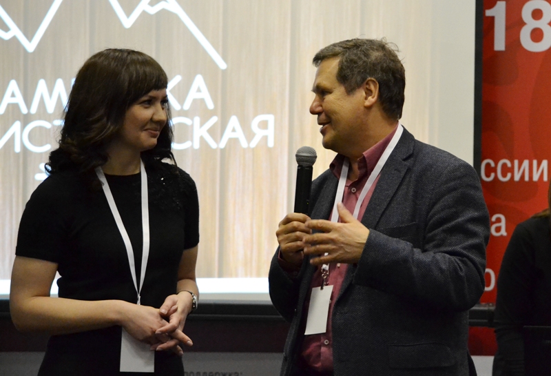 Алена Стратонова (Агентство по туризму Камчатки) и Александр Сирченко, заместитель генерального директора «ТТ-Трэвел», во время совместной презентации турпродукта Камчатки на "Интурмаркет-2018"