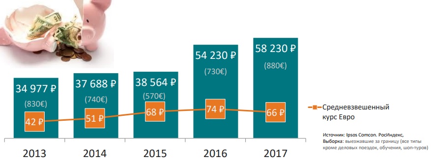 Из данных компании (исследование «Росиндекс 2017»), следует, что по сравнению с 2015 годом средние затраты на зарубежный отдых в 2017-м (на 1 человека) выросли на 51%, по сравнению с 2014-м – на 55%, и по сравнению с докризисным 2013 годом – на 67% (в этом году средняя сумма затрат на отдых за рубежом составила, по данным IpsosComcon, 34 977 р. на человека). Отметим, что рост цен на зарубежные поездки в 2017 году не коррелирует с динамикой средневзвешенного курса евро.