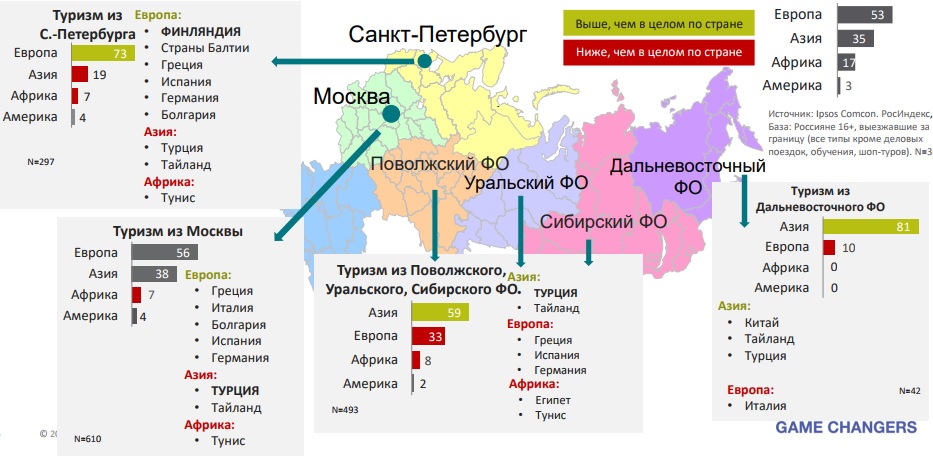 Региональная картина распределения зарубежных поездок отличается от московской. Так, доля тех же Турции и Таиланда как азиатских главных направлений у жителей Поволжского, Уральского и Сибирского федеральных округов составила 59%. Популярность этих азиатских направлений существенно возросла: в 2016 году доля стран Азии в зарубежных турпоездках жителей этих федеральных округов была на уровне 49%.