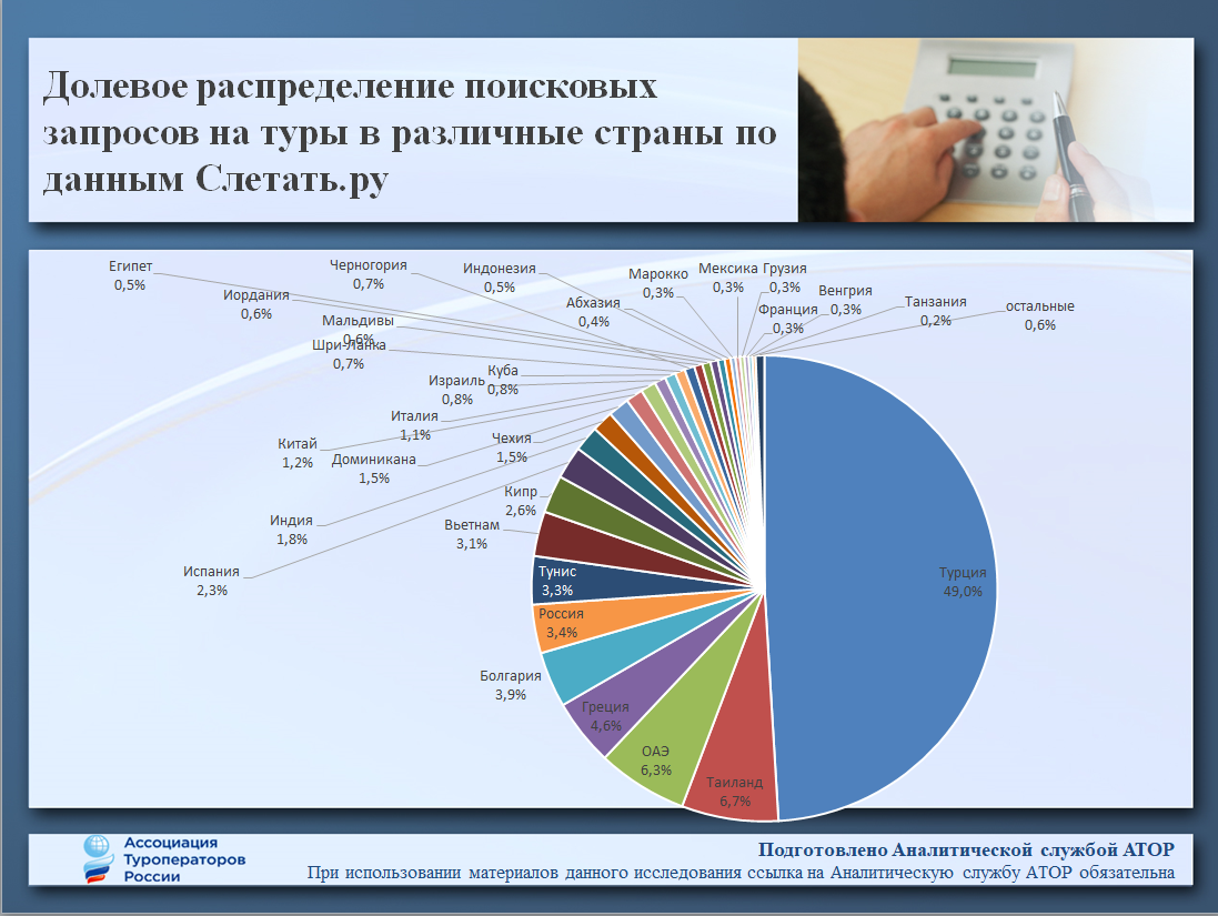 В список лидеров по поисковым запросам пользователей всех сервисов Слетать.ру вошли (доля в общем числе поисковых запросов на туры в %): Турция (49%), Таиланд (6,7%), ОАЭ (6,3%), Греция (4,6%), Болгария (3,9%), Россия (3,4%), Тунис (3,3%), Вьетнам (3,1%), Кипр (2,6%) и Испания (2,3%).