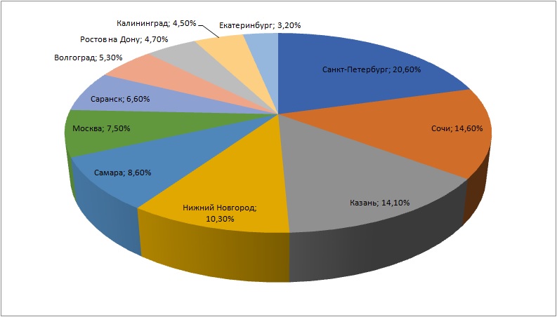 Рис. 1. Доли билетов на бесплатные поезда, оформленных до городов, где проводятся матчи ЧМ 2018 (на 14 мая 2018 г), %