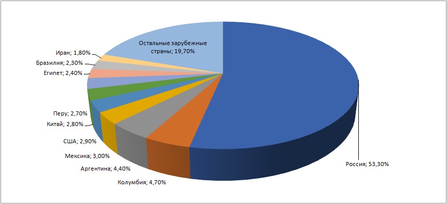 Всего на 14 мая в поездах, предназначенных для бесплатной перевозки во время Чемпионата мира по футболу 53% составляют российские граждане, 47% - иностранцы. Такое же долевое распределение россиян и иностранцев на бесплатных поездах было и неделю назад, уточняют в «Транспортной дирекции-2018». В ТОП-10 стран, чьи граждане оформили наибольшее количество бесплатных мест на спецпоездах, кроме России вошли Колумбия, Аргентина, Мексика, США, Китай, Перу, Египет, Бразилия и Иран. На рис. 2 представлено долевое распределение оформленных мест.