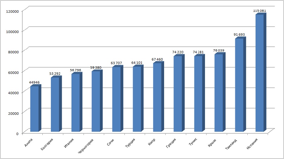 Рис. 1. Средняя цена пакетных туров на пляжные туры в середине июня (вылет 09.06 из Москвы, на семь ночей, на двоих, рублей)