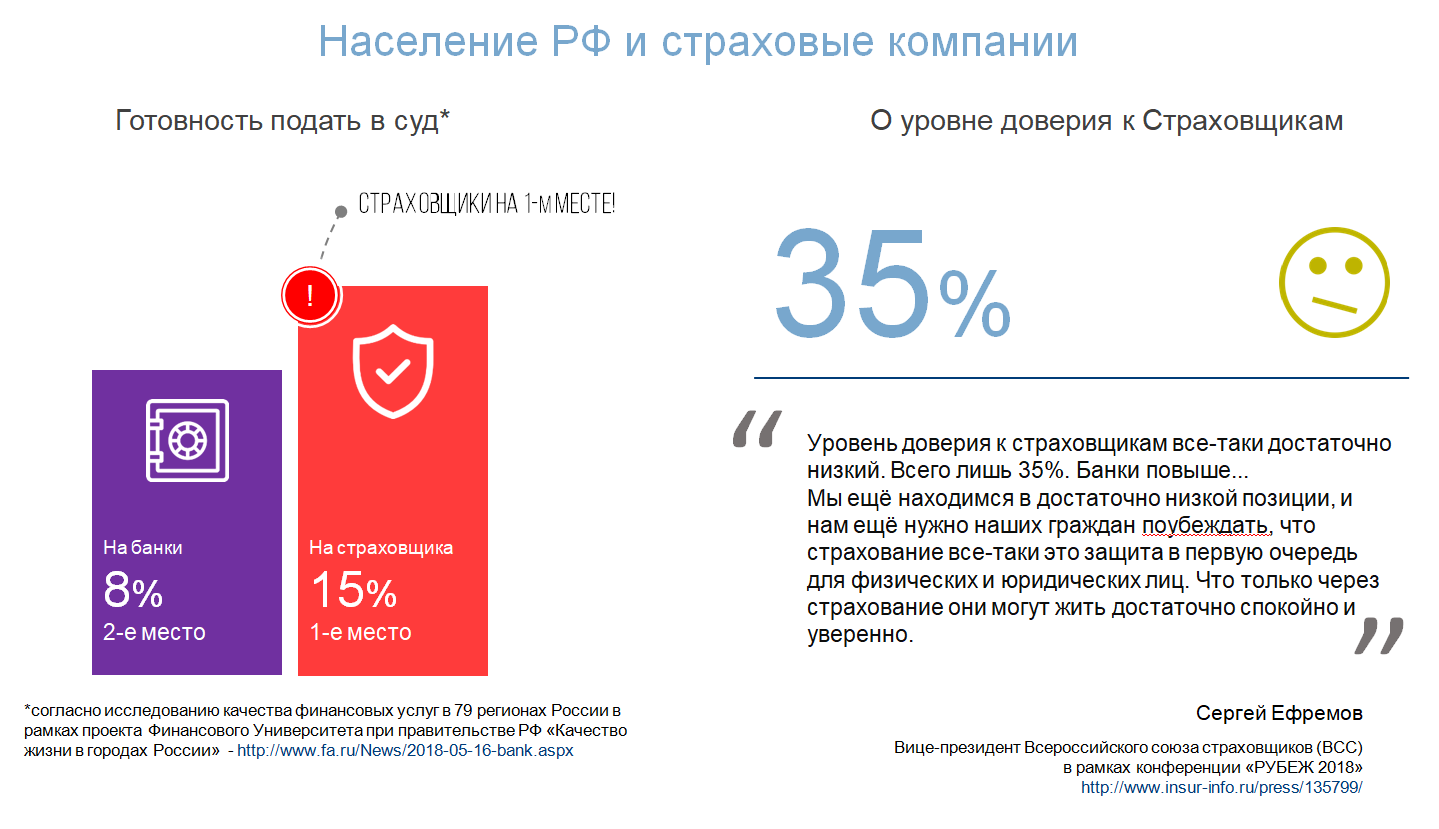 - Симптомы всем видны, но о них почему-то не принято говорить вслух. Уровень доверия потребителя к нам ниже, чем к банкам, впереди нас по индексу недоверия – только СМИ. Готовность подать в суд на страховщиков у населения – вообще самая высокая среди всех отраслей. Почему это мы наблюдаем?