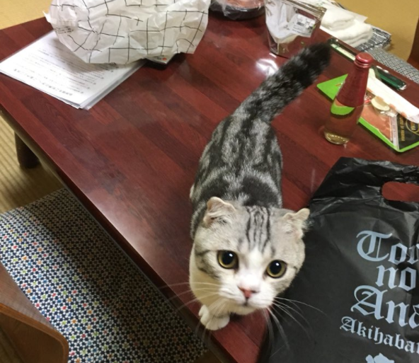Фото из твита mituyasann. По оценкам специалистов-фелинологов, в рёкане проживает довольно интересный котенок - помесь скотиш-фолд (шотландской вислоухой кошки) с каким-то видом бобтейла.