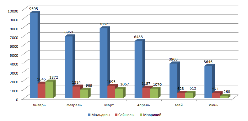 Лето – время «низкого» туристического сезона на островных экзотических направлениях Индийского океана. Из рис. 1. наглядно видно, что тренд на сокращение российского турпотока летом по сравнению с зимними месяцами имеет практически один и тот же характер на всех трех основных направлениях дорогой островной экзотики.