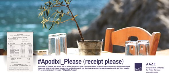 Кампания «Apodixi Please», слоган которой можно перевести как «Чек, пожалуйста», организована независимым органом по государственным доходам (IAPR). Плакаты, билборды, постеры с обращениями к туристам расклеены и развешаны в магазинах, ресторанах, кафе, на пляжах и в других общественных местах города, а в интернете распространяются через Google Ads.