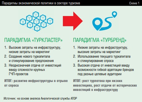 Прежде всего, хотелось бы объяснить две определяющие парадигмы политики, проводимой в туристическом секторе России, – «туркластер» и «турбренд» (см. схему 1).