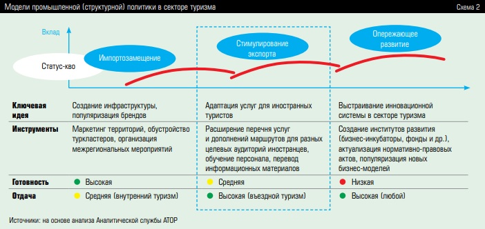 Важно отметить, что прежде, чем возникнет инновационная экосистема со стимулами для внедрения новых технологий, необходимо создать базовую инфраструктуру и вытянуть конкурентоспособные бренды (модель импортозамещения) и полностью реализовать туристический потенциал через адаптацию услуг (модель стимулирования экспорта).