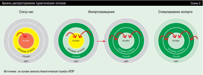 На схеме 3 (ниже) можно увидеть ареалы развития туризма для типичного региона России (безусловно, лидеры в индустрии туризма – Москва, Казань, Санкт-Петербург – уже работают на опережение, но многие регионы все еще сосредоточены в основном на региональных контурах). Первый контур – это регион, второй – другие регионы (соседние и дальние), третий – Россия в целом (федеральный уровень) и мир (въездной туризм).