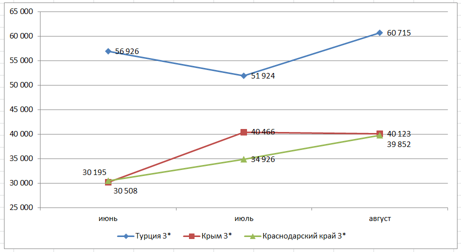 В июне ценовая разница была наивысшей – почти в два раза. Средняя цена на турецкие 3* упала в июле (когда начал действовать эффект от сокращения полетных программ из России) и опять поднялась в августе. Вместе с тем в августе поднялись цены и на российские отели 3*. Ценовая разница между турами в отели 3* Турции и турами в отели 3* в Крыму и Краснодарском крае составляла на протяжении лета от 88% до 27%.