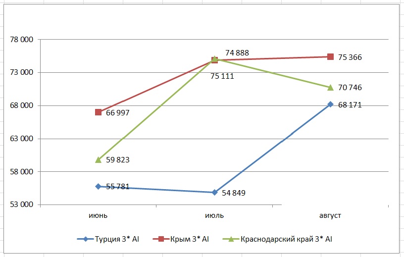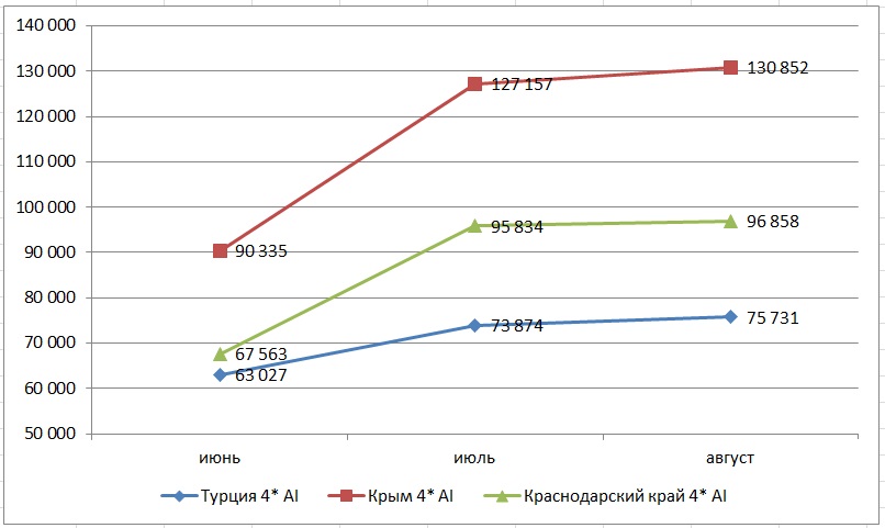 Отметим, что объекты Краснодарского края, работающие со «все включено», по средней цене туров стояли ближе всего к турецким аналогам в июне и в августе (в последнем случае ценовая разница составляла всего 2,5 тыс. р.). Отрыв Турции от Крыма по отелям 3* AI был более значительным, но тренд был такой же – турецкое «все включено» по средней цене туров выигрывало все лето.