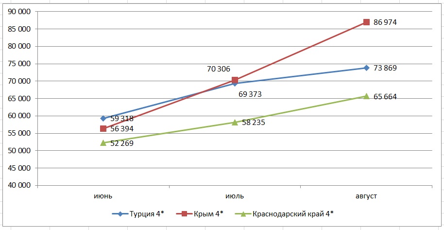 Аналитическая служба АТОР исследовала среднюю стоимость недельных туров в отели Турции и России 3–5* за три летних месяца 2018 года. Данные были предоставлены группой компаний Слетать.ру. Была проанализирована сравнительная динамика изменения стоимости туров 7–10 ночей на двоих взрослых в Турцию, в Крым и Краснодарский край в отели категорий 3*, 4*, 5*. Отдельно исследовались средние цены на все отели по конкретному направлению (без учета типа питания) и средние цены на отели с питанием «все включено» (AI).