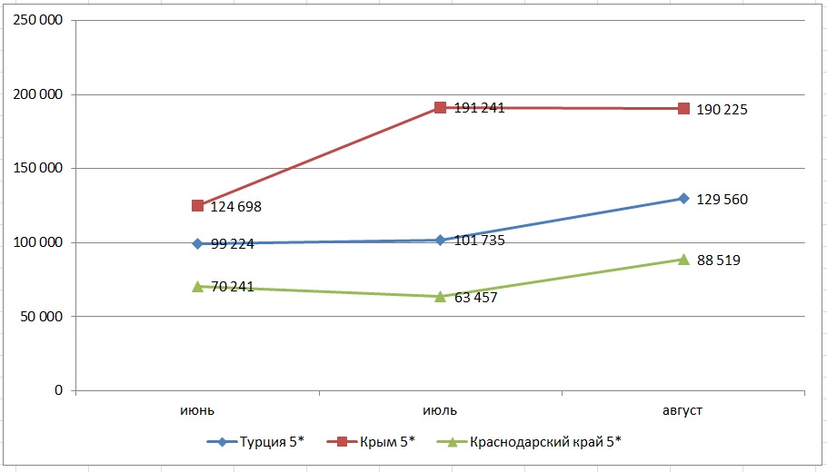В сегменте отелей 5* средние цены туров, взятые без учета системы питания, показывают достаточно уверенное лидерство Краснодарского края на всем протяжении сезона. Следует, однако, отметить, что практически все туры в пятизвездочные отели Краснодарского края подразумевают завтрак. Это (с учетом того, что турецкие «пятерки» все работают на «все включено») и предопределило вполне адекватную разницу средних цен (около 40 тыс. р. за тур на двоих в пользу Краснодарского края).