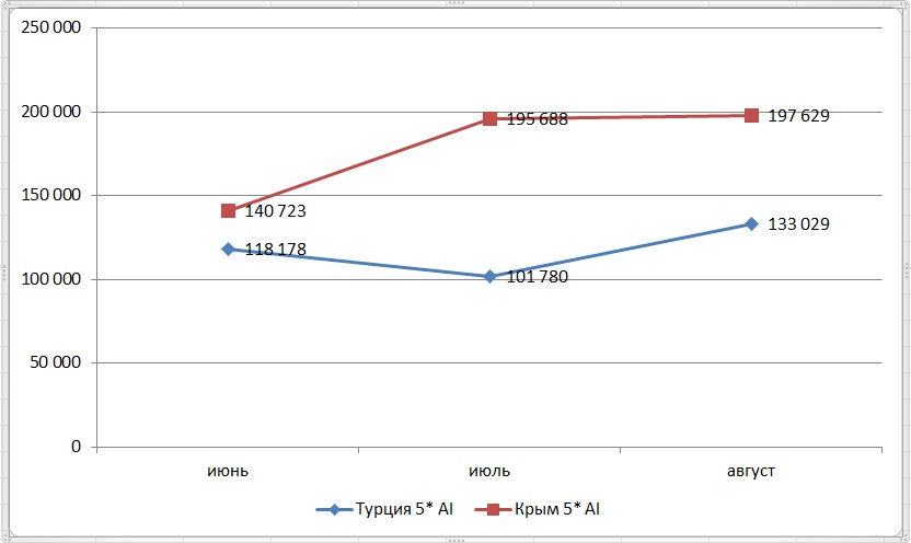 В то же время крымские цены на туры в объекты 5* даже с учетом «фактора завтраков» оказались выше, чем на турецкие пятизвездочные отели с All Inclisive. Ценовая разница между средней ценой тура в отель 5* в Крым и в отель 5* в Турцию в июле достигала 90%, т.е. турецкие пятерки стоили почти в два раза дешевле.