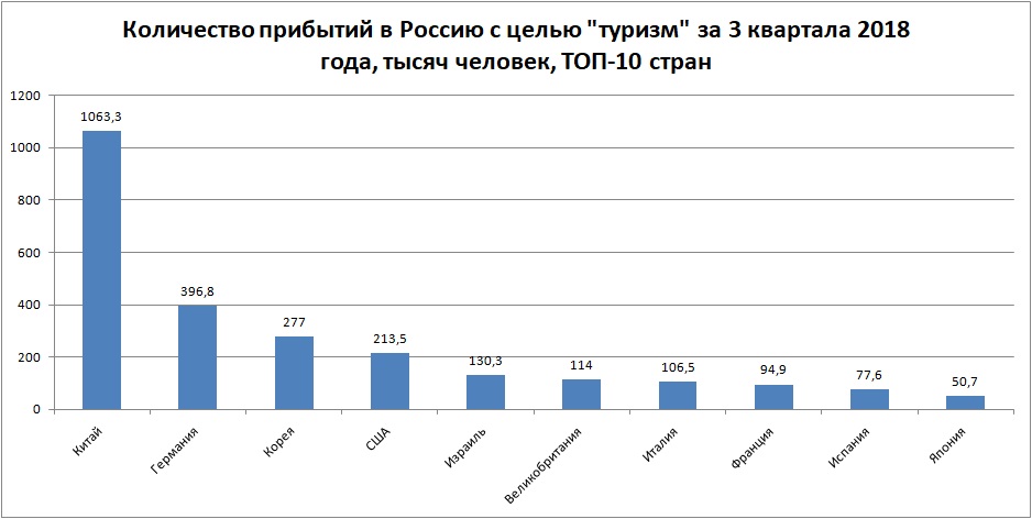 Основным поставщиком туристов в Россию по итогам трех кварталов 2018 года остается Китай. С января по сентябрь этого года нашу страну посетили 1,1 млн китайцев, указавших туризм в качестве цели своего визита. Всего же за 9 месяцев Россию с разными целями посетили 1,7 млн китайцев. Туристический поток из Китая вырос на 11% в сравнении с аналогичным периодом прошлого года.
