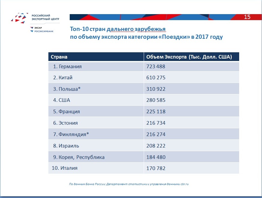Свою часть этой большой работы выполняет и АО «РЭЦ»: Центр разрабатывает меры возможной поддержки экспорта туруслуг, которые могут быть полезны для регионов и для туроператоров, а также полноценные аналитические исследования для определения приоритетных рынков, на которых Россия может зарабатывать больше.