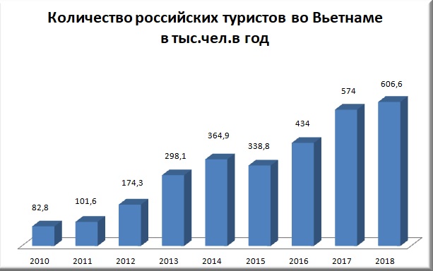 По данным Вьетнамской национальной администрации по туризму (VNAT), за 2018 год в стране зафиксировано 606 637 туристических прибытий из Российской Федерации.