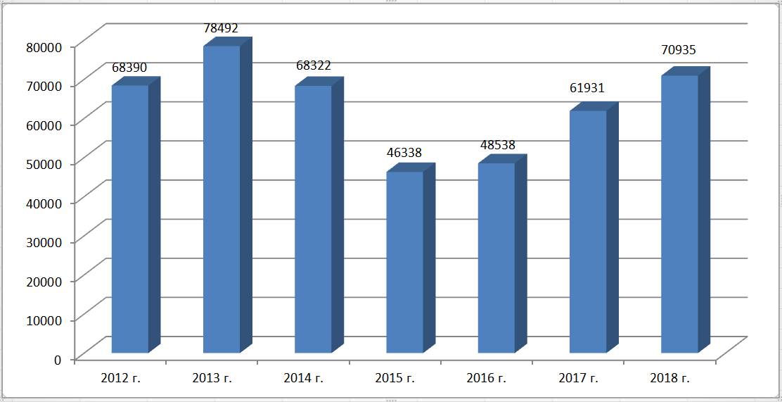 Рис.1. Количество туристических прибытий граждан России на Мальдивские острова, человек, 2012-2018 гг.