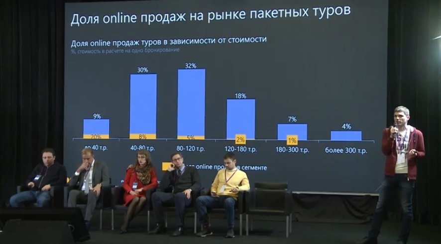 Объемы онлайн-продаж пакетных туров в России, подчеркнул г-н Победкин, демонстрируют интересную зависимость от стоимости тура. Так, в категории туров стоимостью до 40% рублей пятая часть (20%) продается именно в онлайне.
